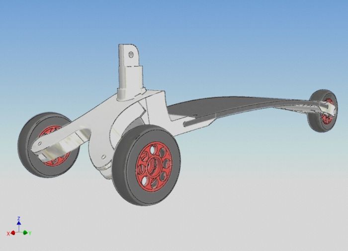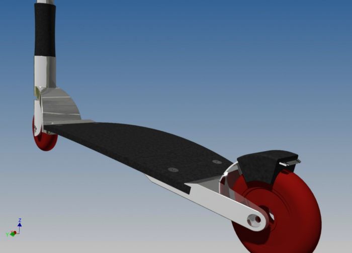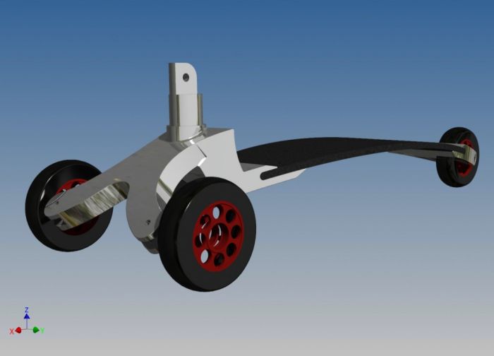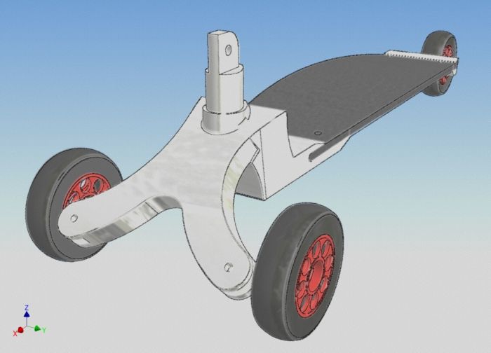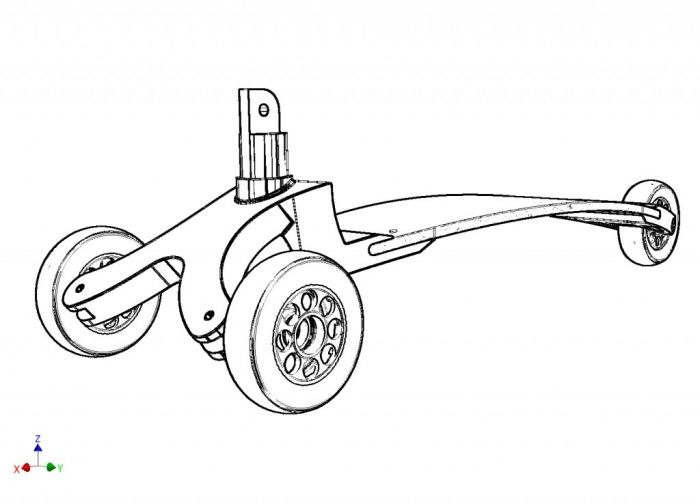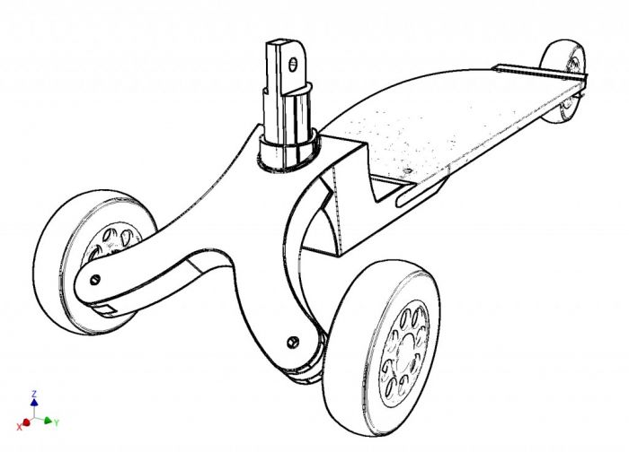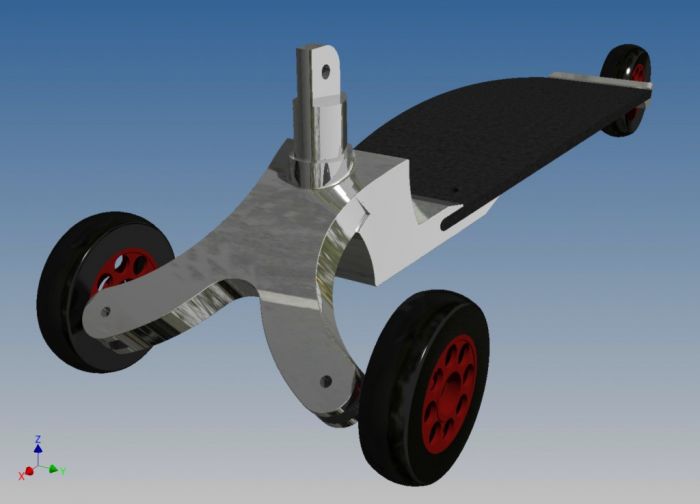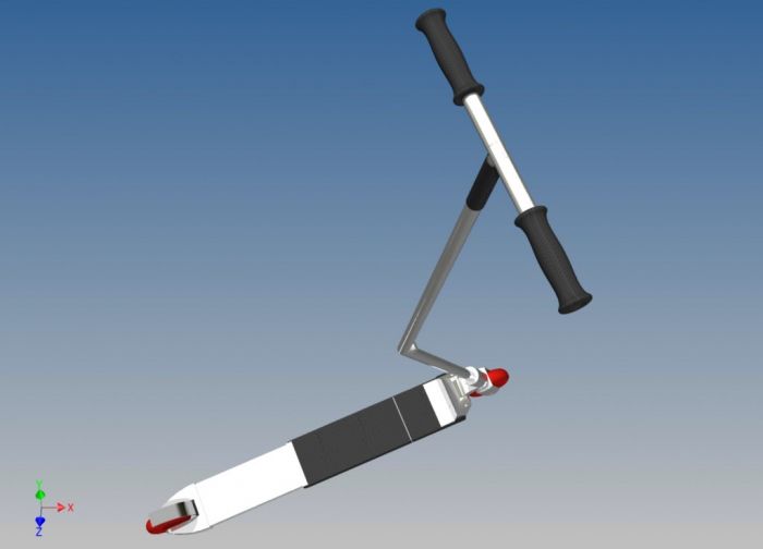 Drei- und Mehrrad-Trottinett. Entwicklung des Kickboard bis zum Jumpy. Lenkgeometrie für die einhändige Steuerung (wie Auto). Modulare Elemente, aus denen weitere Varianten entwickelt werden können. Ein-Griff-Steuerung mit Gummiknopf für optimale Haptik.