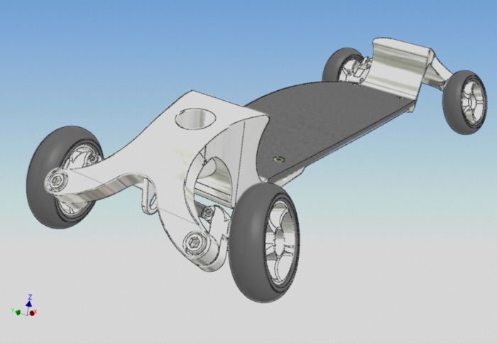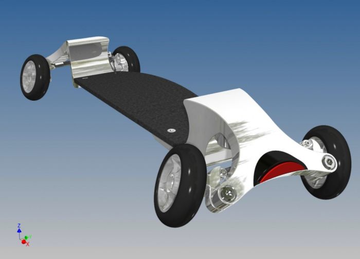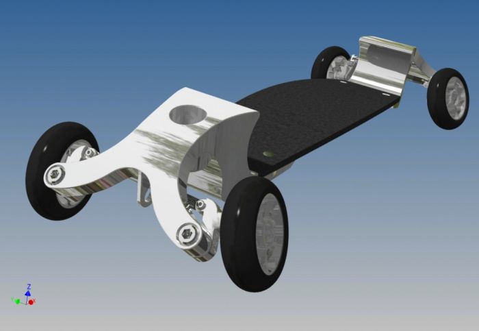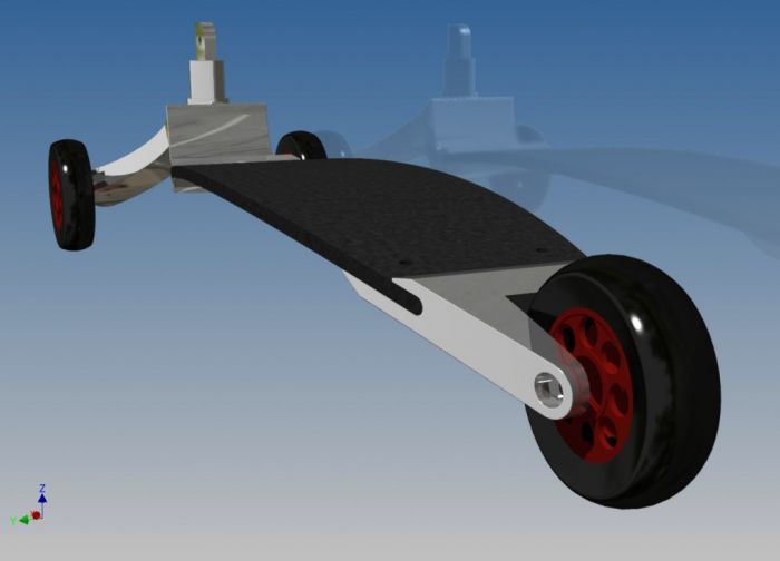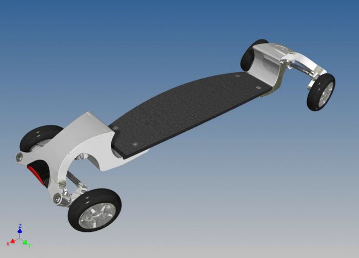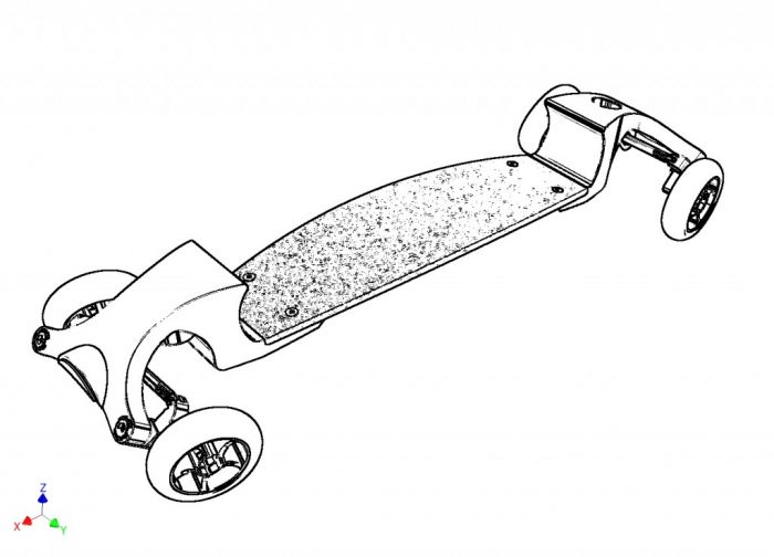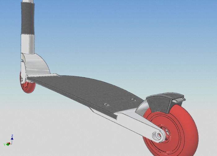Zweirad-Trottinett. Entwicklung des Minitrottis. Möglichst klein, leicht, zusammenlegbar. Modularer Aufbau (Brettlänge, höhenverstellbarer Lenker, austauschbarer Vorder- und Heckteil, diverse Räder)
