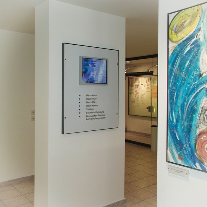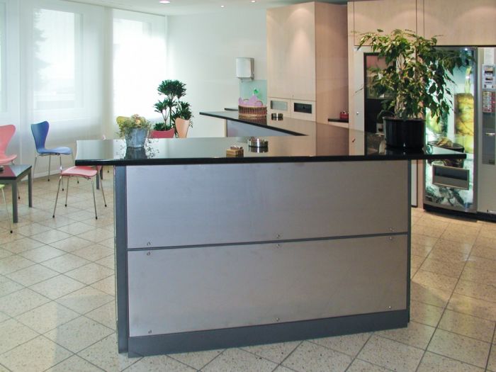 Gestaltung, Umbau, Sanierung, Baueingabe und Ausführung von Eingang/Empfang, Cafeteria und Treppenhaus. Beleuchtung durch eigens entwickeltes System.